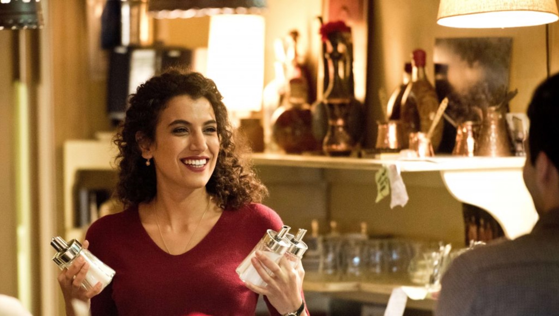 Bild: Amal (Zahraa Ghandour) im Café © Filmcoopi Zürich/Dschoint Ventschr